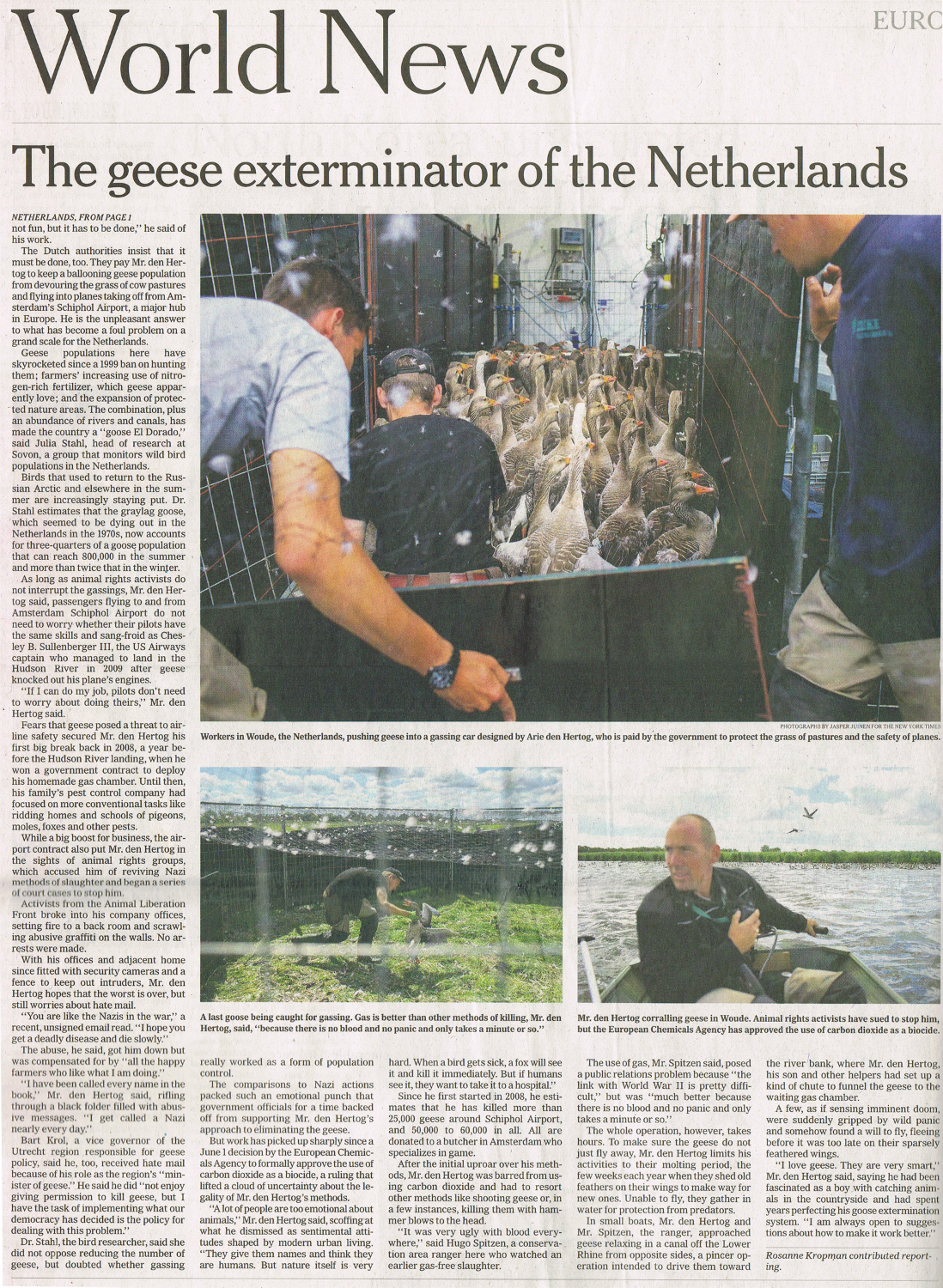 Ganzen mogen vanaf 1 juni in heel Nederland gedood worden door middel van vergassing. Tot voor kort was dit alleen toegestaan in een straal van 20 kilometer rondom Schiphol, omdat de dieren daar een gevaar voor het vliegverkeer vormen. Nu kunnen de ganzen ook elders met gas bestreden worden, vanwege de landbouwschade die zij veroorzaken. Lees meer